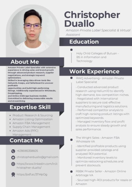 Hi, I’m Christopher Duallo, an experienced Amazon VA, hands-on experience in product research, sourcing, and inventory support. I specialize Private Label and also in Online Arbitrage and Wholesale sourcing using tools like ProfitPath, Keepa, and SellerAmp. I help clients identify profitable products, improve sourcing efficiency, and support…